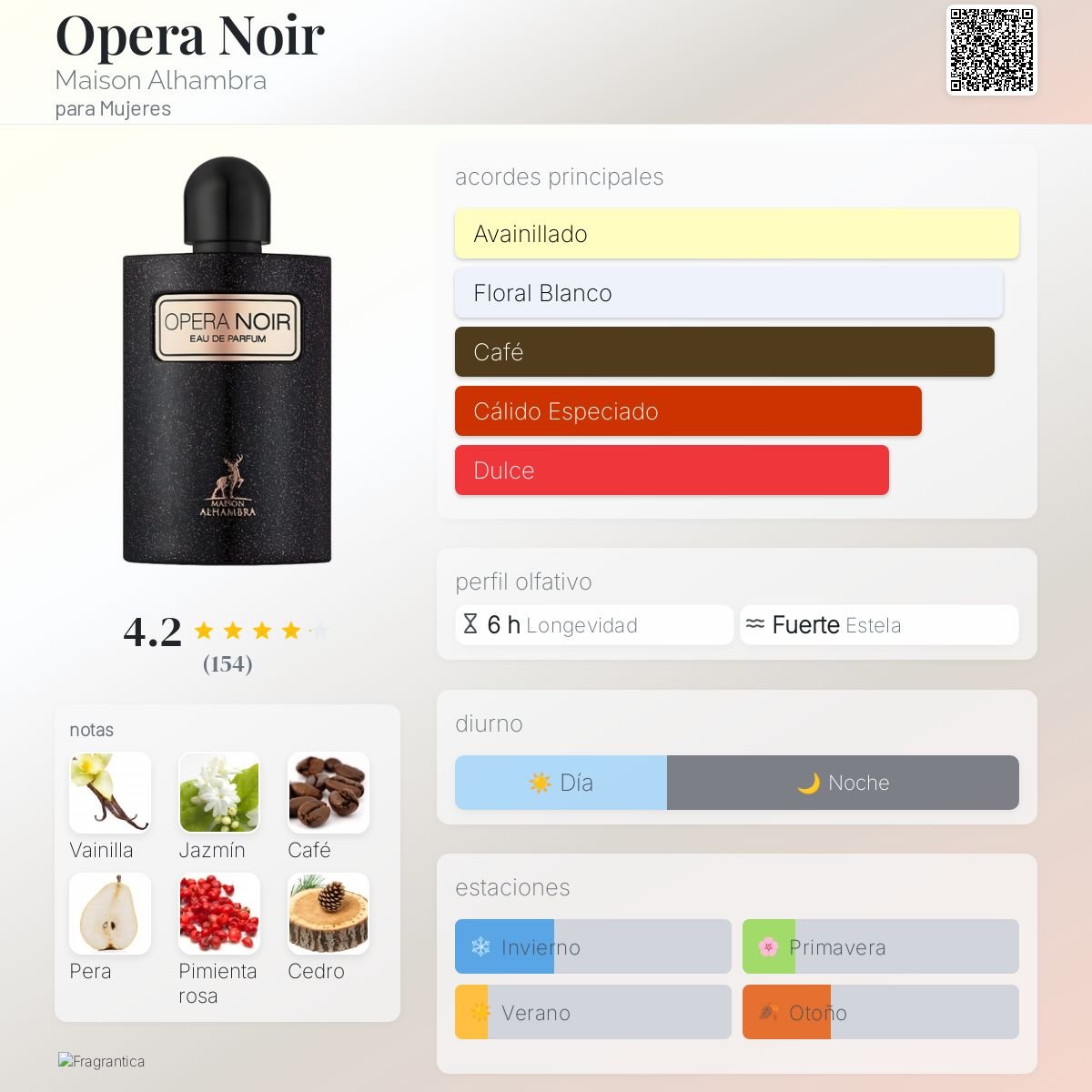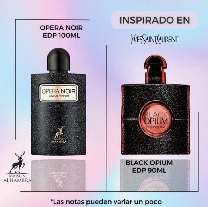 🌹 Opera Noir de Maison Alhambra es una fragancia floral femenina que encarna elegancia y misterio. Perfecta para mujeres que desean destacar con un aroma cautivador y sofisticado, esta creación combina dulzura, intensidad y un toque especiado que la hace única.